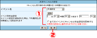 ![]() | キャンセル料金を設定するイベント・セミナーを選択し、詳細を設定します。
